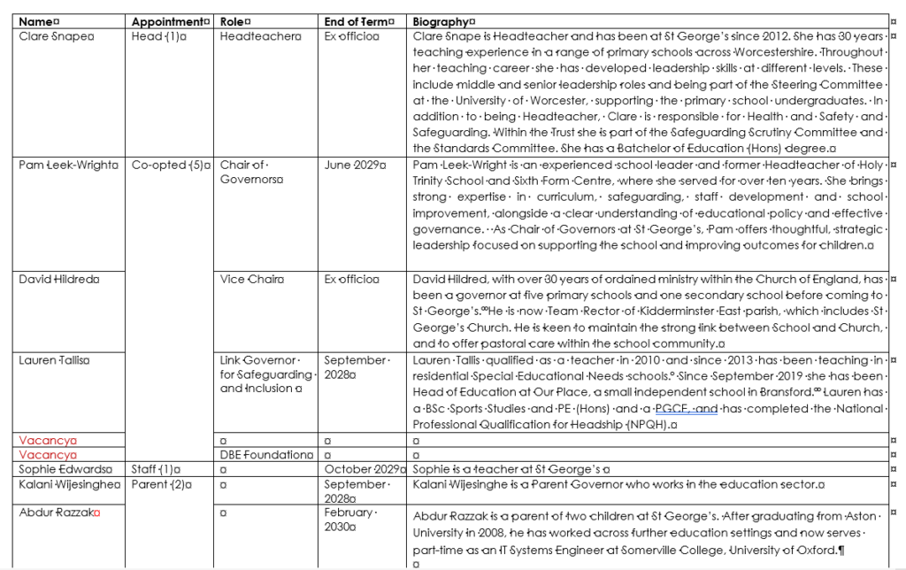 To contact our Chair of Governors (Mrs Pam Leek-Wright) please directly contact the St George’s C of E School office and they shall set up correspondence – office@stgprimary.org